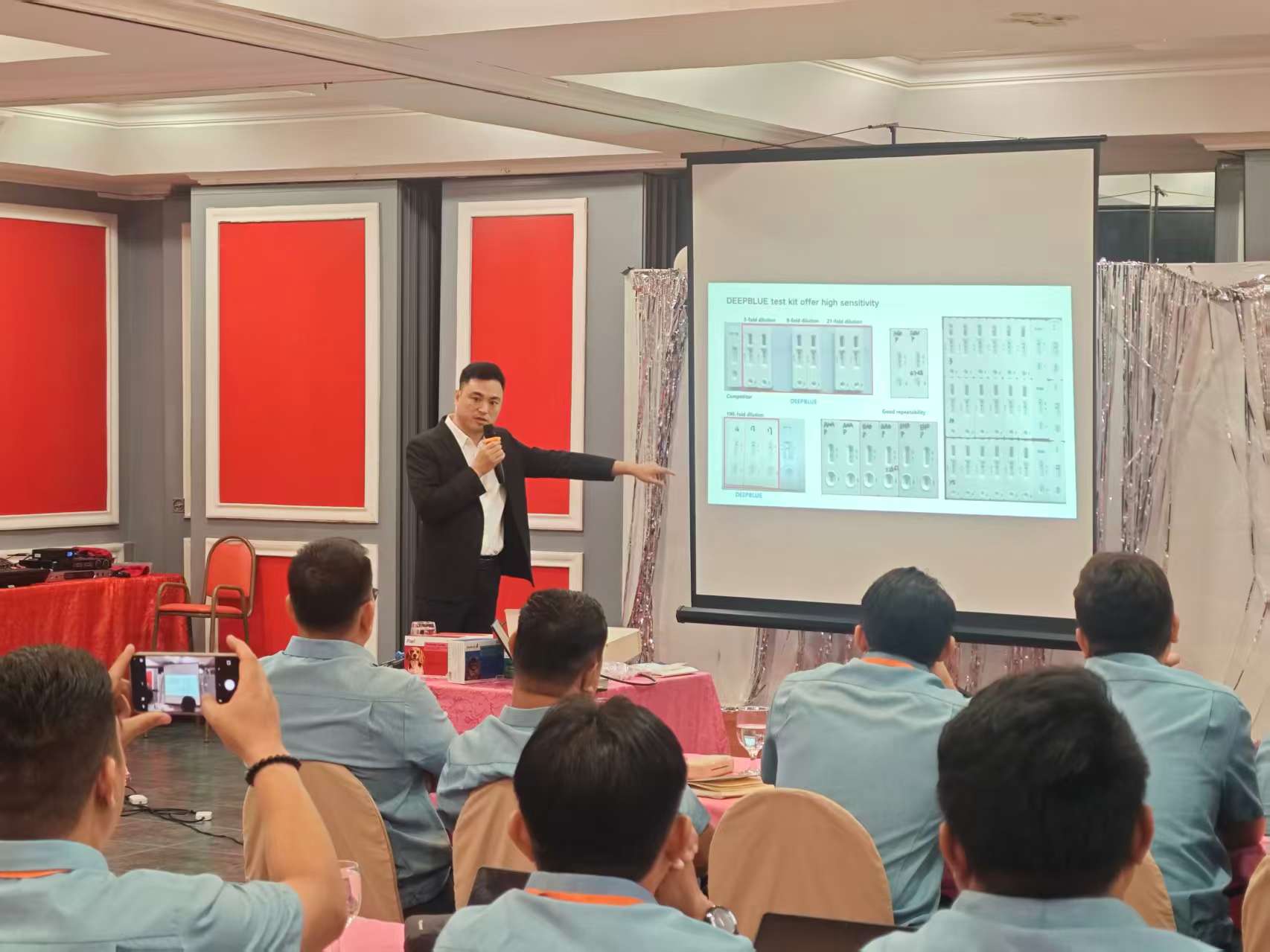 在培训交流活动中,国际部经理李俊率先登台,围绕深蓝医疗自主研发的系列检测产品进行了全面而生动的介绍。从研发背景到技术参数,从操作便捷性到市场应用前景,李经理的讲解逻辑清晰、重点突出,让客户对深蓝医疗的产品有了深刻而系统的认知。理论培训之后,技术研发员余倩现场进行了专业的检测演示。她手法娴熟、操作严谨,每一个步骤都精准到位。现场检测结果清晰、可靠,产品性能在客户眼前得到了最直观的验证,赢得了客户的高度认可与一致好评。