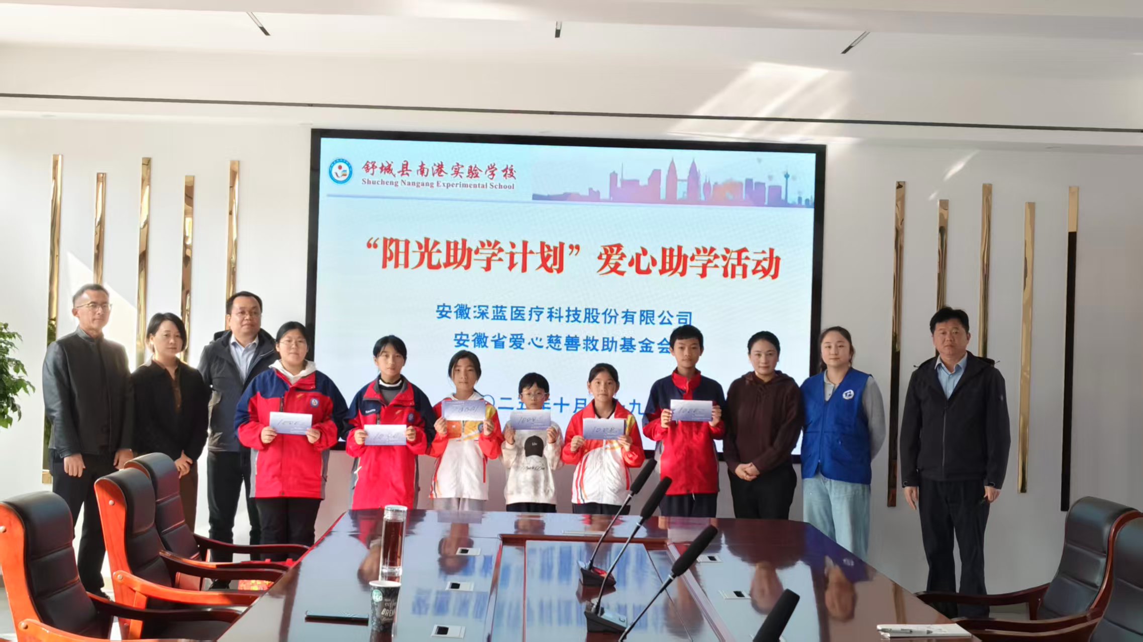 秋光和煦,暖意盈怀。2025年10月29日,安徽深蓝医疗科技股份有限公司“阳光助学计划”爱心团队携手安徽省爱心慈善救助基金会,走进六安市舒城县南港实验学校,一场兼具温度与深度的爱心助学活动在此温情启幕。深蓝医疗以实际行动践行企业担当,为逆境中的学子点亮逐梦之光,让这个金秋更添暖意。